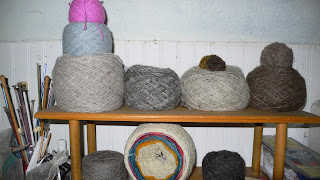 So far the WIP's that I am working on organizing are my spinning. I've been collecting small bits and bobs of fiber and spinning it up. It then gets wound off and made into a 'cake'. I pulled out this behind the sink shelf and placed it on my desk where I do most of my spinning. I have a LOT more to collect and organize, but at least I made a start. I will collect knitting bags later and see what in each one...